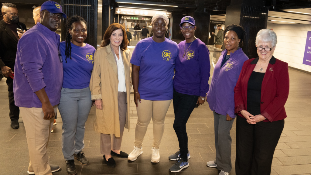 S:US’ SOS Team Richard Byamugisha, Charisse White, Jemima Babb, Crystal McClelland, and Sandrine Clarke with Governor Hochul and NYS Office of Mental Health Commissioner Dr. Ann Sullivan. Photo credit: NYS Governor’s Office.